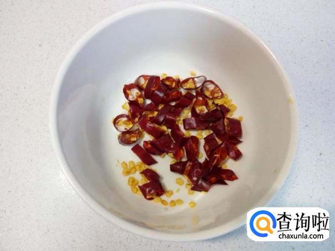 锅内放入油加热,油七,八成热时关火。稍凉后,倒入红干椒的碗中,炸成辣椒油。