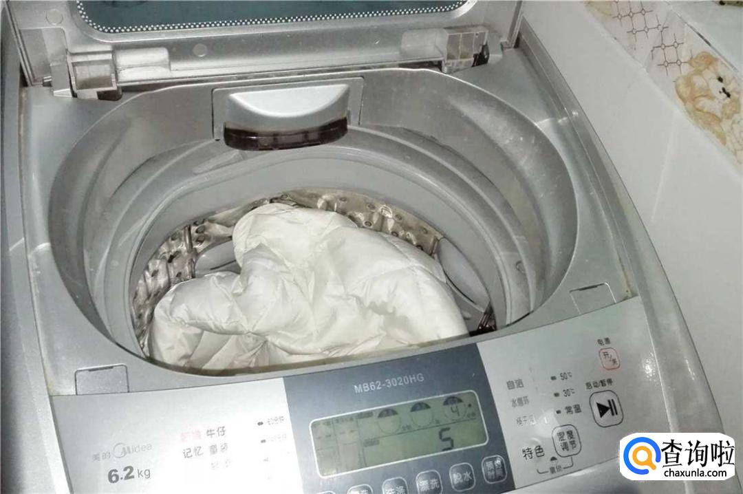 然后将羽绒服放入洗衣机里机洗,加入洗衣液。