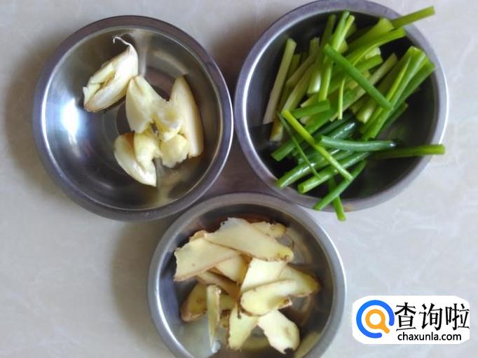 屈头蛋的乳鸭和姜片、蒜米、香葱准备好。