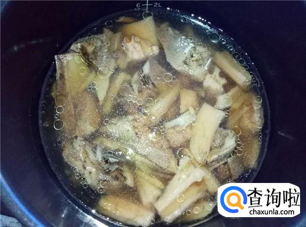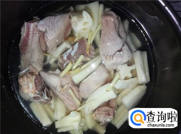 把清洗好的莲藕、烫过水的扇骨和姜丝,一起放入锅里,加入适量的水,水一般是盖过骨头就可以了,太多水煮出来的汤就不浓了。