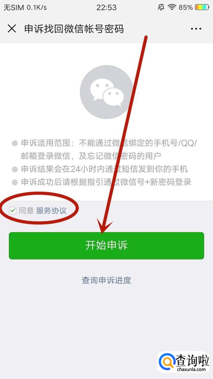 进入下一页面,勾选“同意服务协议”,点击“开始申诉”,如图所示。