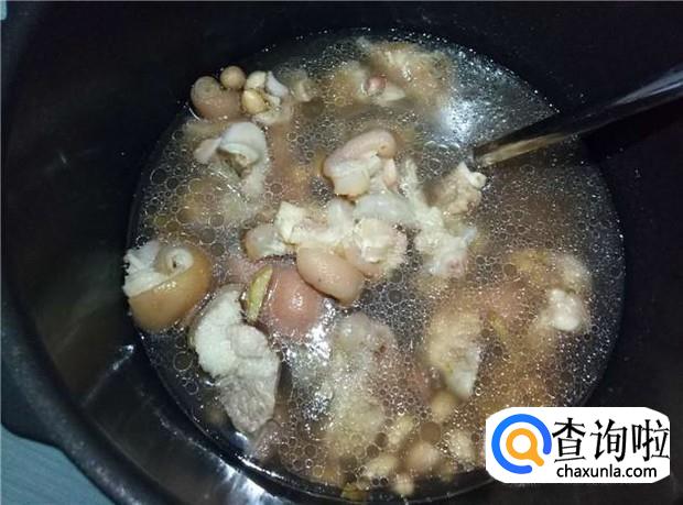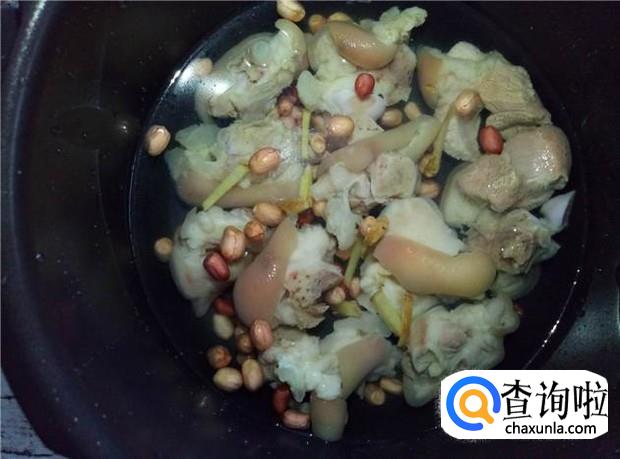 把清洗好的猪脚和泡好的花生,一起放入高压锅中,加入适量的水、姜片,放压力电饭煲里,按煮汤的按钮,大概炖1小时即可。如果是普通的电饭煲,时间需要长一些。