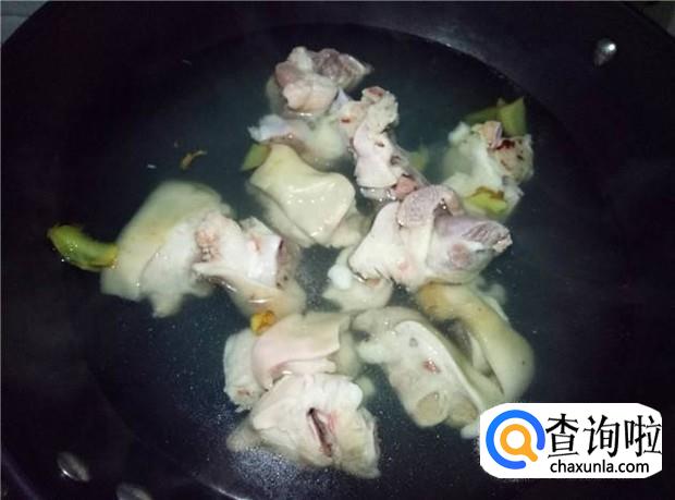 猪脚清洗一下,然后倒入开水中,先烫一下水,等水再次煮开后,把猪脚捞起来放凉水中清洗,把猪脚上的猪毛、猪蹄位置的白色猪皮都清洗干净。