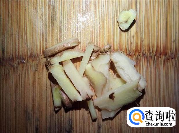 姜切片,锅里放入适量的姜片、料酒和水,煮开。