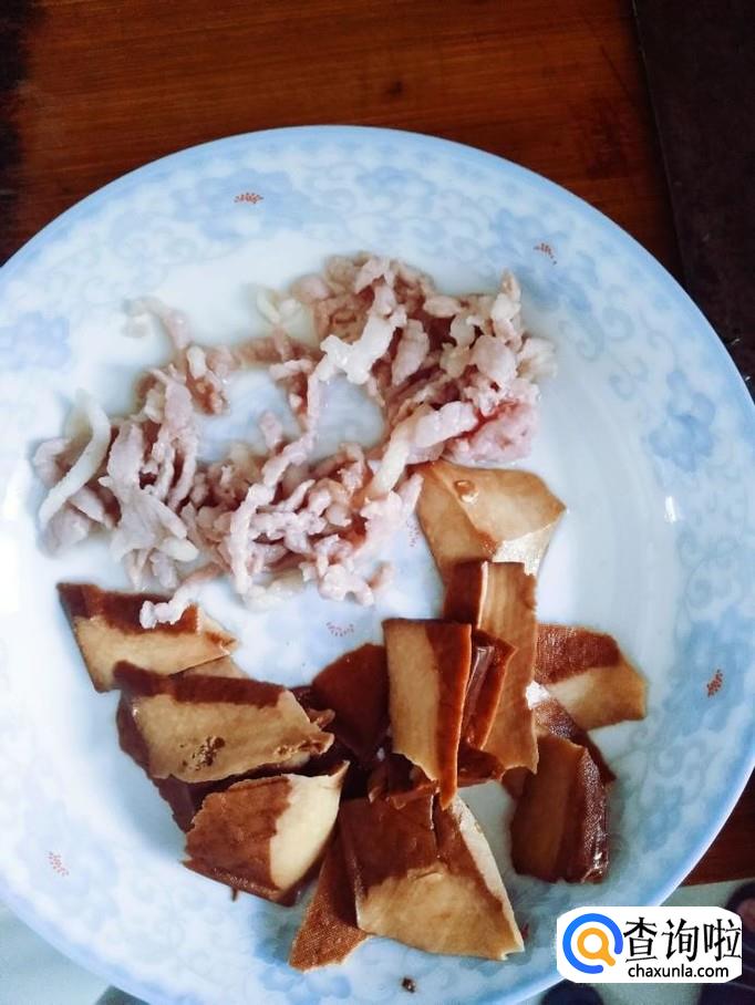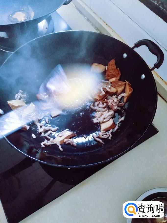 锅中浇少许油,放入肉丝和茶干大火翻炒。