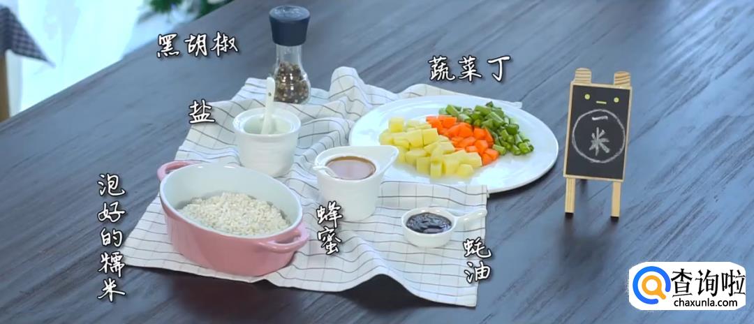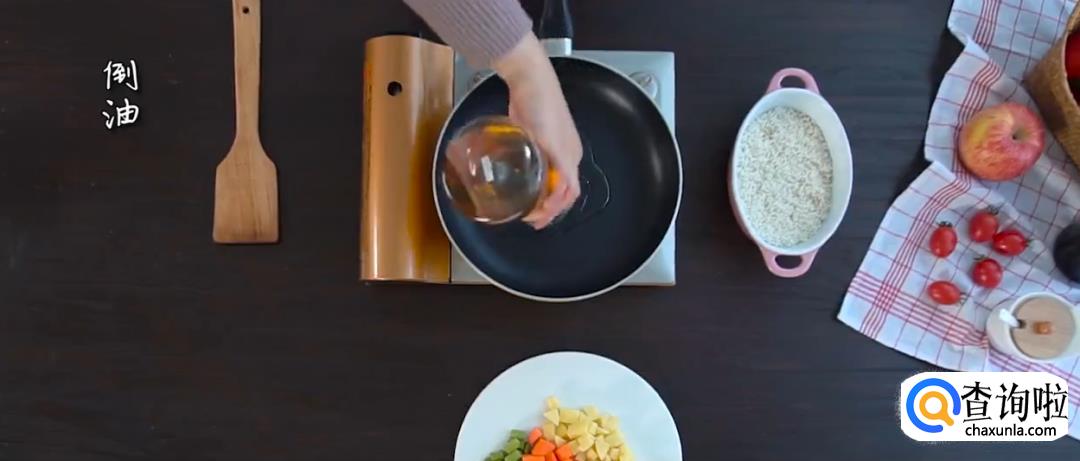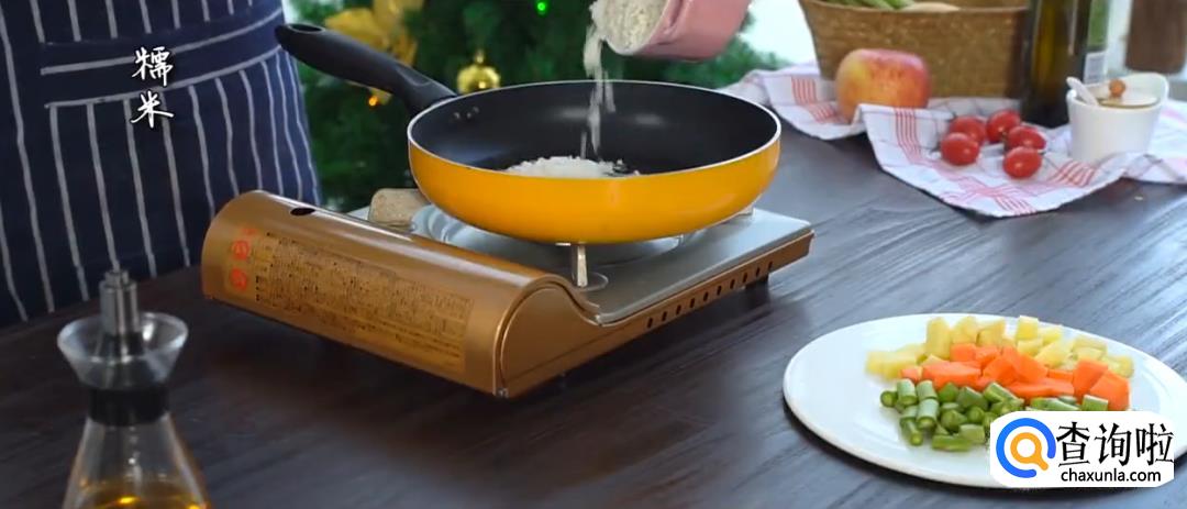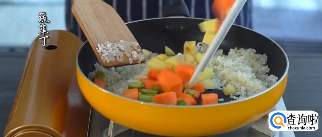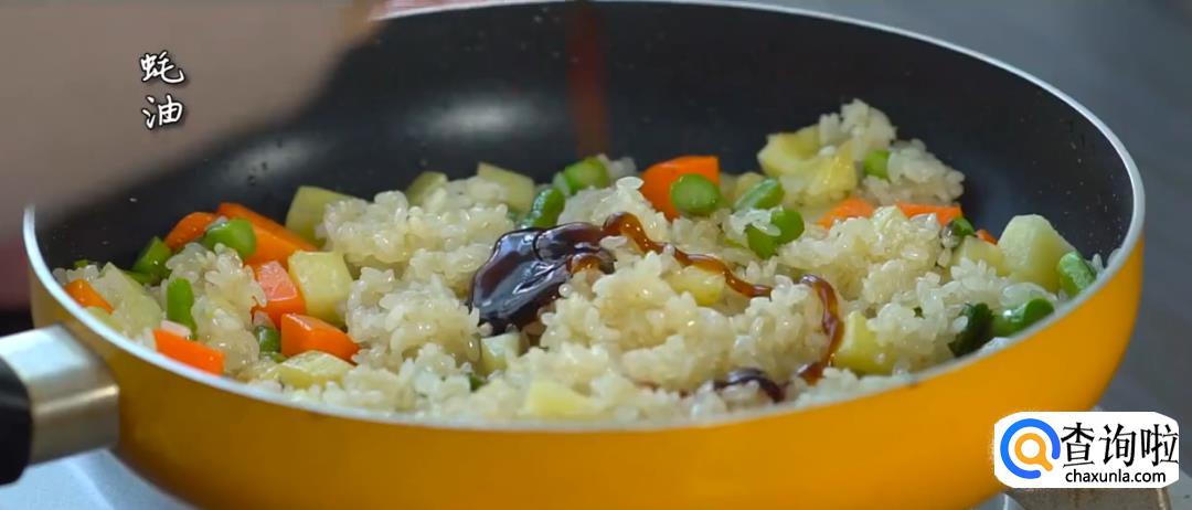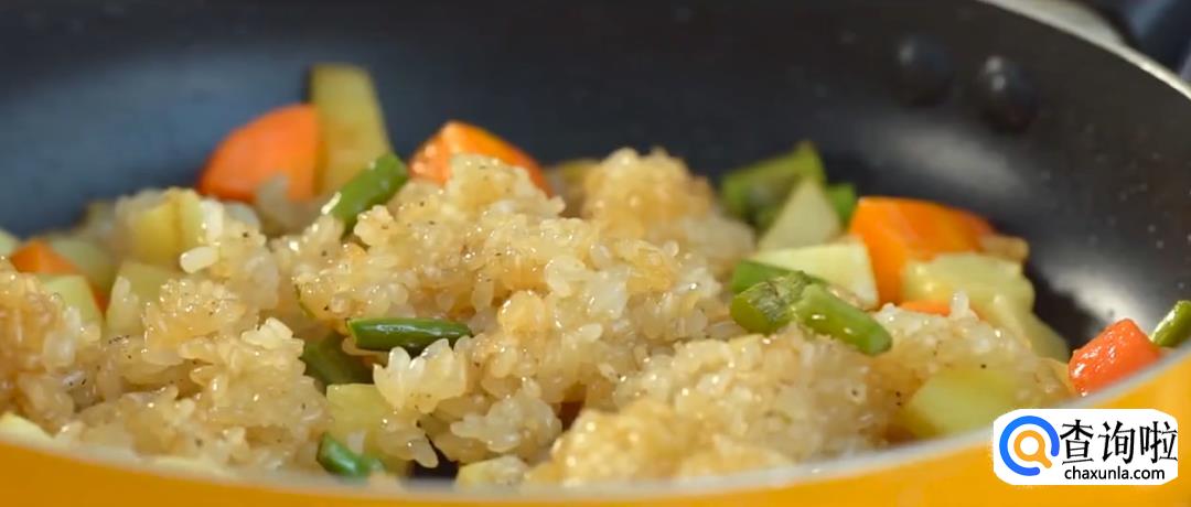 热锅起油,下糯米进行翻炒,然后倒入蔬菜丁,加黑胡椒翻炒均匀。