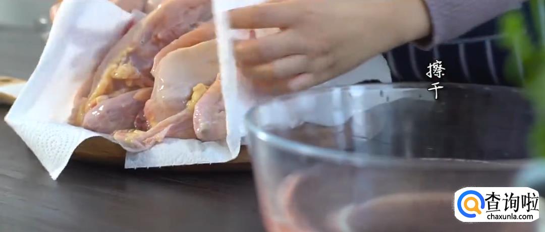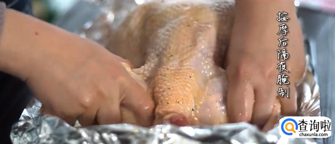将鸡从盐水中捞出,擦干后抹上酱料,用手不断摩擦鸡肉进行腌制。