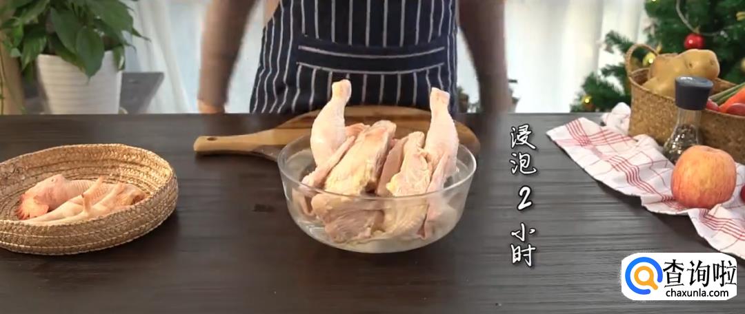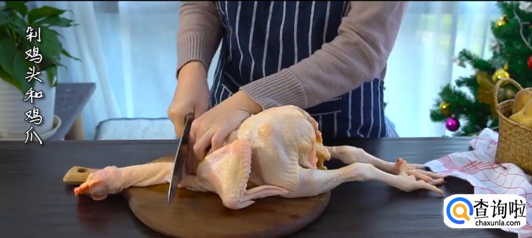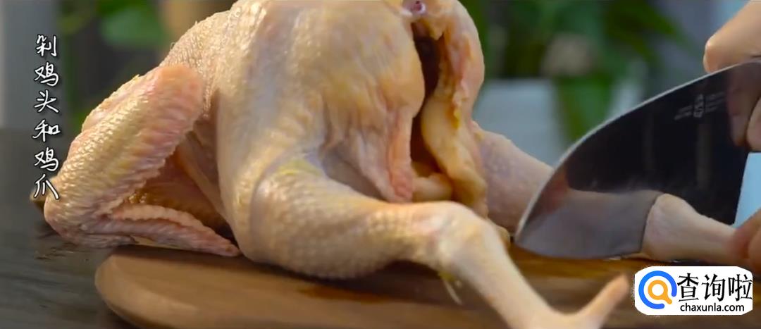 将鸡的头和腿去掉,用5:100的盐水浸泡鸡肉。