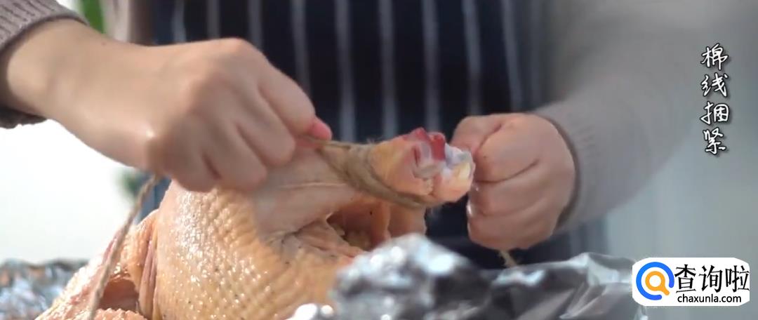 将炒好的糯米饭塞入鸡肚子中,用牙签封口,用绳子将鸡腿捆住。