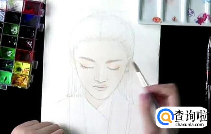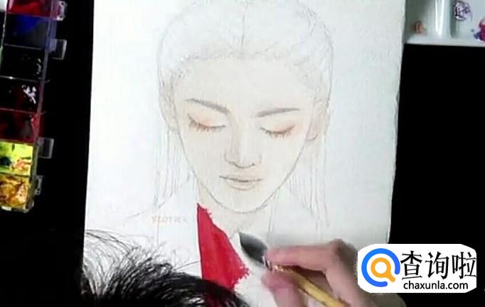 用水彩在她的皮肤上铺上一层淡黄色,用于调节皮肤的颜色,某些地方比如嘴巴,眼睛周围,鼻梁适当颜色深一点