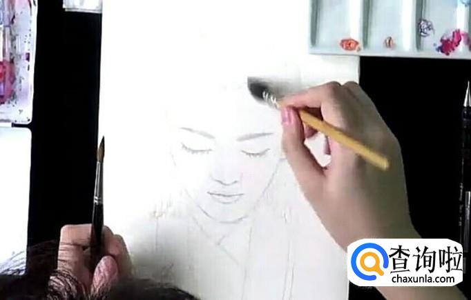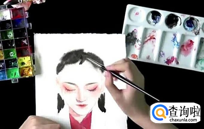 下一步画眉毛,沿着最初用铅笔画好的眉线用黑色水彩画好,注意不可以太浓厚,然后用水晕开,恰到好处最好