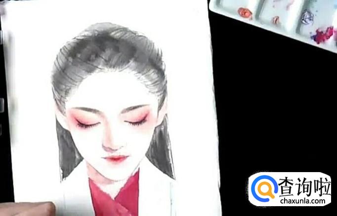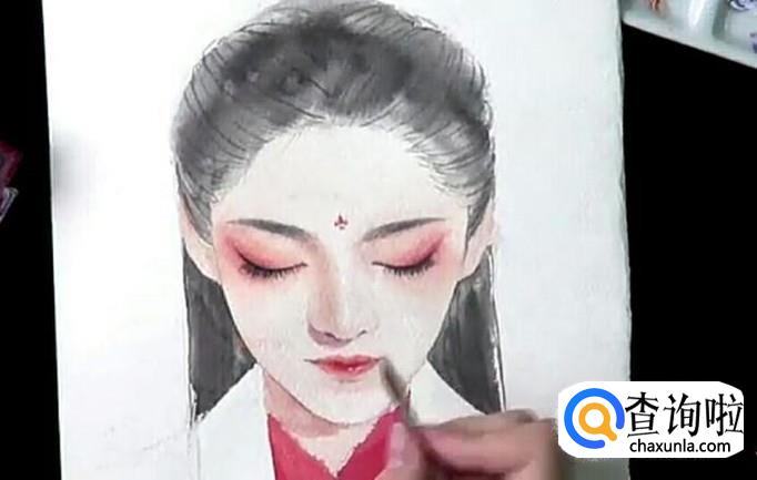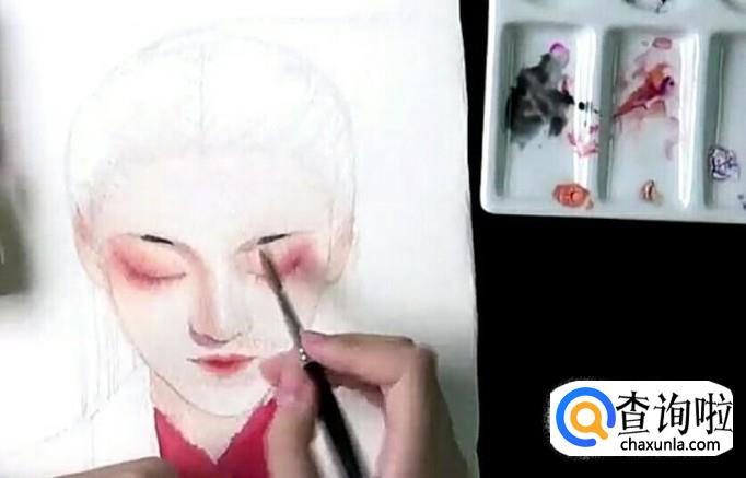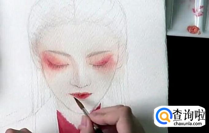 色干了以后可以加深一下嘴唇和眼睛,鼻梁周围的颜色,此时可以用红色加深,不能直接涂,应该用水晕开