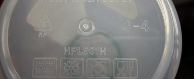 PP(聚丙烯),多用以制造水桶、垃圾桶、箩筐、篮子和微波炉用食物容器等等。这种材料制造的塑料容器具有透气性佳、耐热温度高且有较高的耐冲击性,机械性质强韧,抗多种有机溶剂和酸碱腐蚀。常见豆浆瓶、优酪乳瓶、果汁饮料瓶、微波炉餐盒 。其中5号聚丙烯,带有字母PP标识的熔点高达167℃,是唯一可以放进微波炉的塑料盒,可在小心清洁后重复使用。需要注意,有些微波炉餐盒,盒体以5号PP制造,但盒盖却以4号PE制造,由于PE不能抵受高温,故不能与盒体一并放进微波炉。