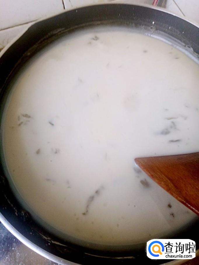 找个厚底锅,把溶解的红薯粉倒入锅中,红薯粉和水的比例是,一份红薯四份水的量,加入对好的水准备开火。