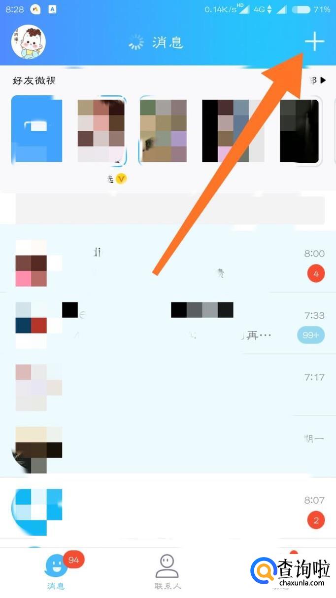 首先打开手机QQ,点击右上角,然后点击子菜单里面的“加好友”。