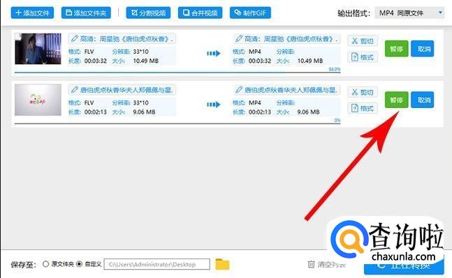 添加完成后,点击有左下角的输出格式为“MP4格式”,然后点击下方选择自己输出文件的位置,最后点击“转换”,如下图所示: