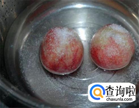 用苏打粉清洗干净之后,咱们炒菜用的细盐,直接倒在手里一些,然后用两只手拿起一个毛桃上下左右的搓一搓。