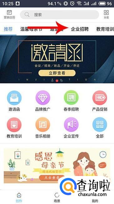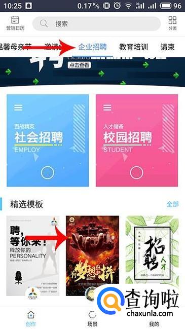 进入易企秀创作界面之后,在上方TAB栏中点击“企业招聘”切换。
