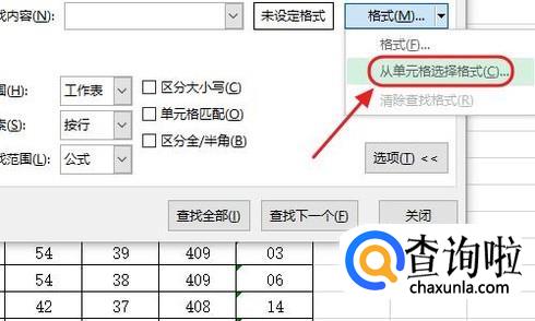 接下来查找内容输入框的右侧就会多出一个“格式”选项,我们点击它;然后从下路选项中再次点击“从单元格选择格式”;