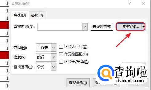 此时鼠标就会变成取色器图标了,我们对着任意一个红色背景的单元格点击一下鼠标即可,然后点选对话框的“查找全部”;