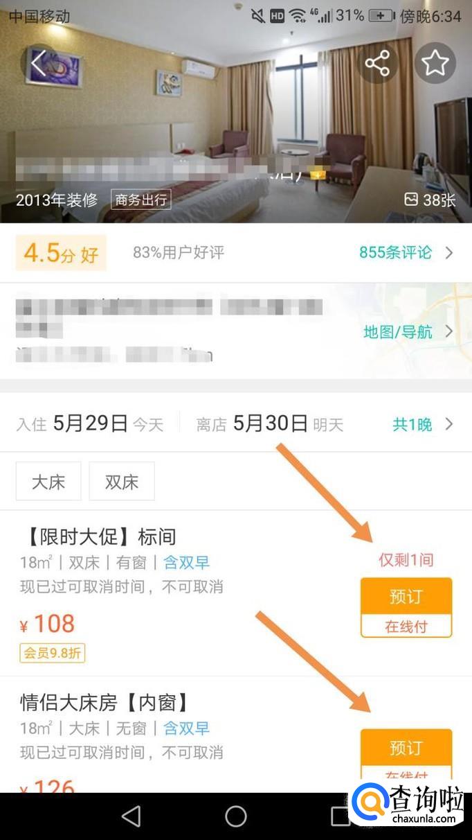进入某一家酒店后,选择你想居住的房间,就可以进行预订了,如下图。