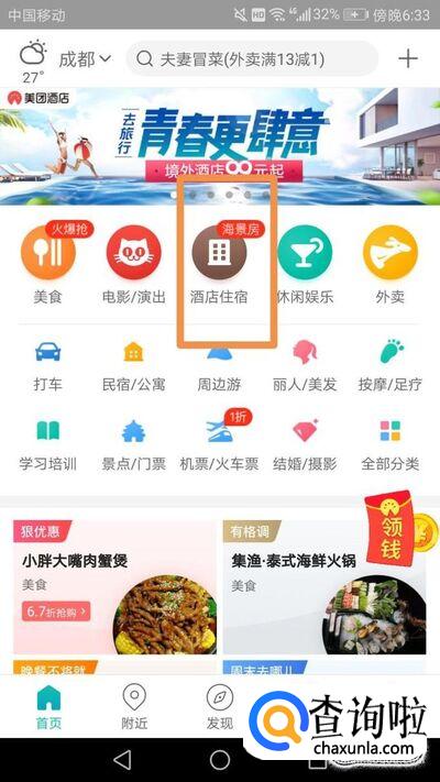 进入美团APP首页,上面有一个酒店住宿,如下图。