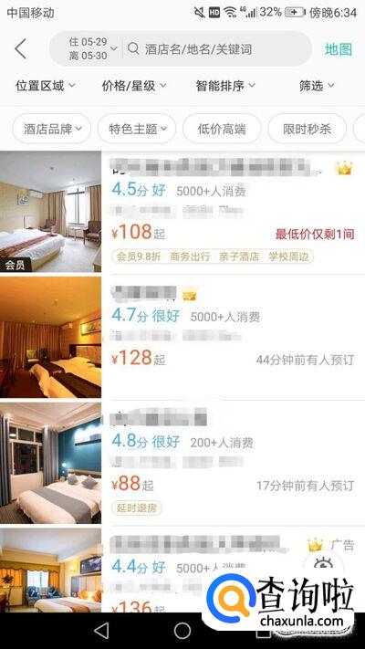 然后就会给你显示很多符合你要求的酒店信息,选择你满意的酒店,如下图。
