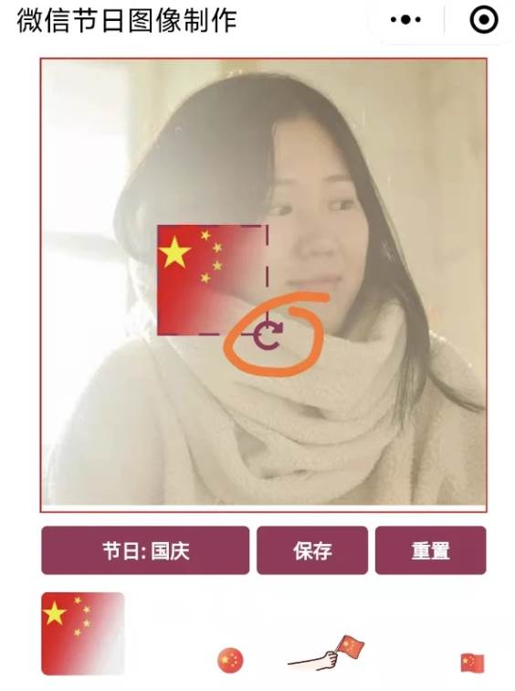 打开微信节日图像制作小程序,直接点击中间的开始制作按钮。小程序会自动读取你的微信头像,拖动就可以放大国旗背景,点击保存,然后去想用这个头像的地方换上这个头像即可。