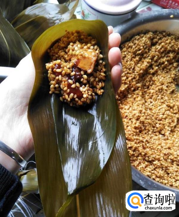 然后把煮好的粽叶折成扇形,然后先放入糯米再放入腌制好的肉块,最后用一层糯米覆盖就可以,然后用绳子固定,这样子粽子就做好了。