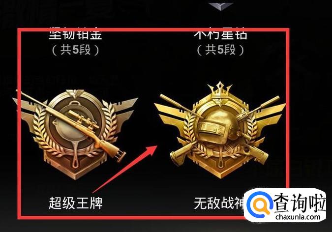 以上的段位每一个段位都有五个小段,但是下面讲的就不一样了玩到超级王牌的玩家必须达到全服的前几百名才能达到无敌战神段位,图标也是非常漂亮的,超级王牌是awm而无敌战神有awm消音和m4消音以及三级头