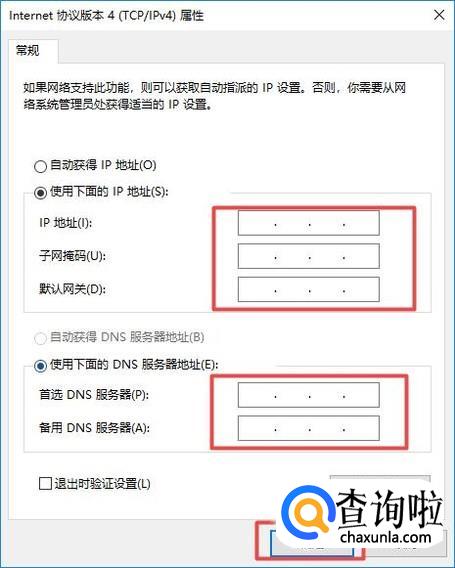 弹出的界面,我们输入想更改的IP、DNS地址,之后点击确定就可以了。