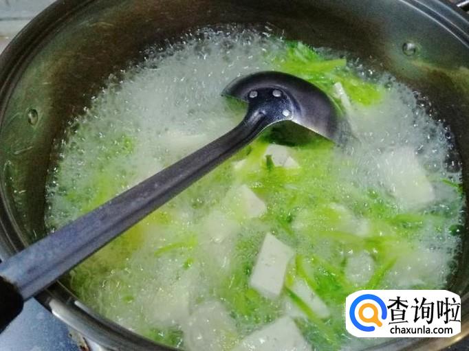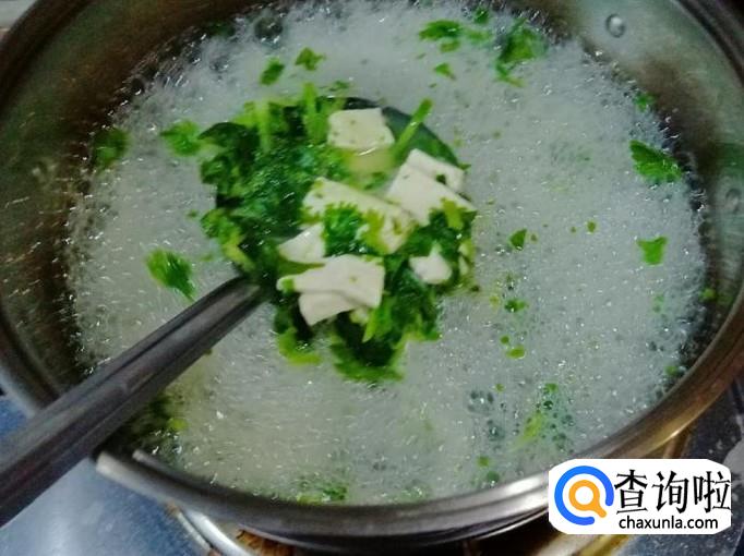最后加入熟芹菜叶子煮开,然后加入备好的鸡蛋液,鸡蛋液尽量从锅边,转一圈倒入,这样倒入的蛋液比较均匀。