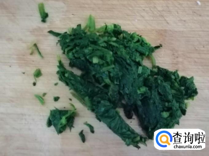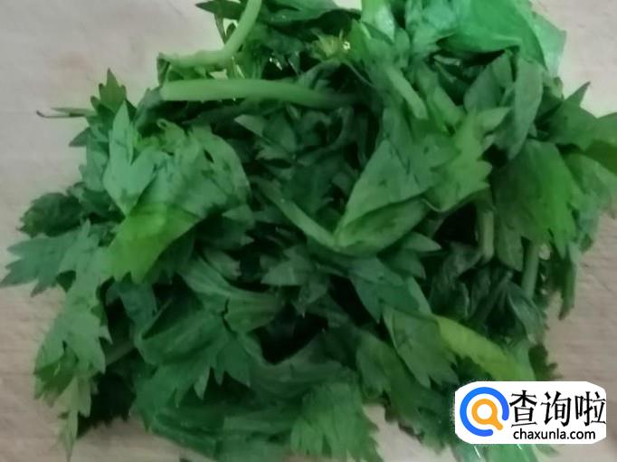 适量芹菜叶子,用清水把芹菜叶子洗净,然后用开水先把芹菜叶子烫熟,晾一会切好待用。