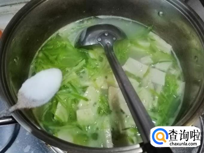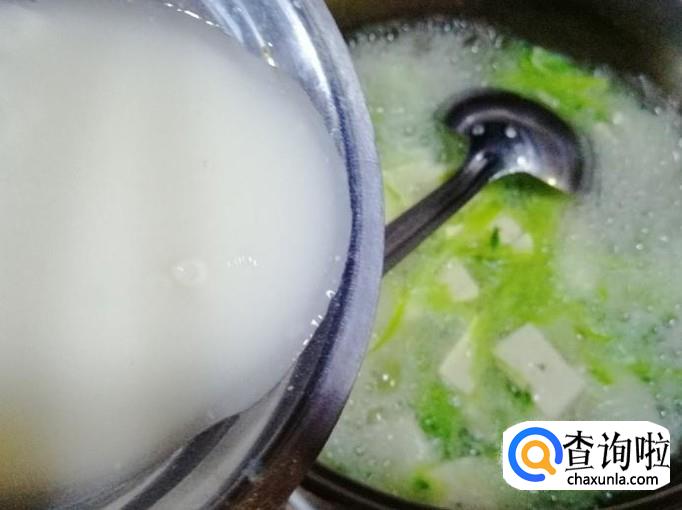 煮开后就可以加入,之前调制好的面糊,边到面糊边用勺子搅拌,以免粘锅底,搅拌均匀后,加入适量食盐。