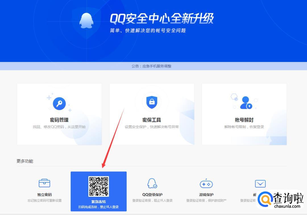 然后在QQ安全中心主页面中找到紧急冻结,鼠标放在上面之后会变成一个二维码,我们用手机QQ扫描这个二维码。