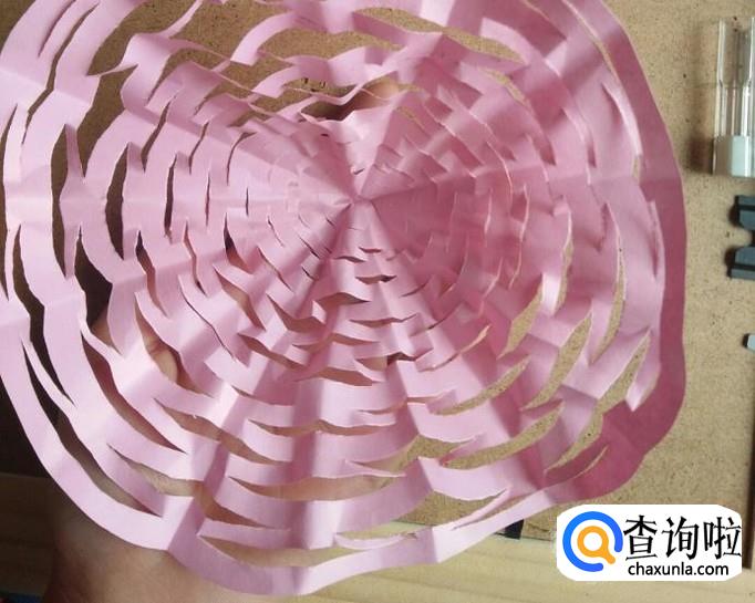 剪完后把它展开,要小心点,否则很容易扯烂。展开后捏着圆心,把纸边慢慢往下拉。