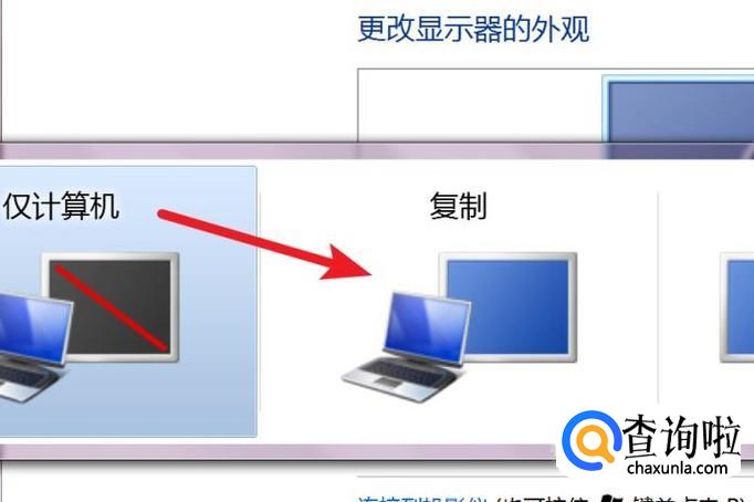 点击后,会弹出选项,我们可以选择‘复制’,这样就可以把显示器显示的内容在投影仪上显示出来了。