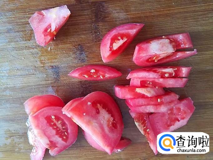 番茄洗净切成如下的块备用。