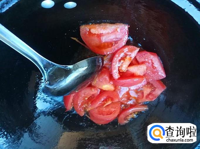 炒菜锅加入适量的植物油烧熟,把切好的番茄倒入锅里,快速翻炒几下。