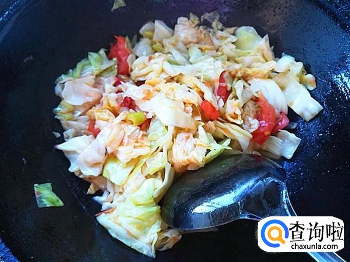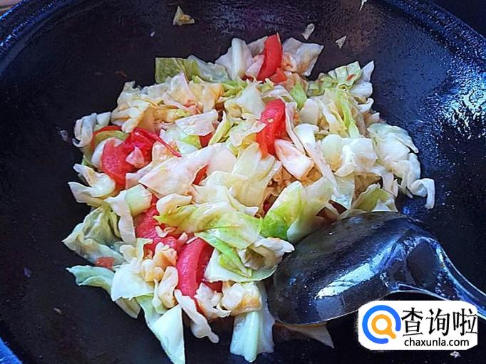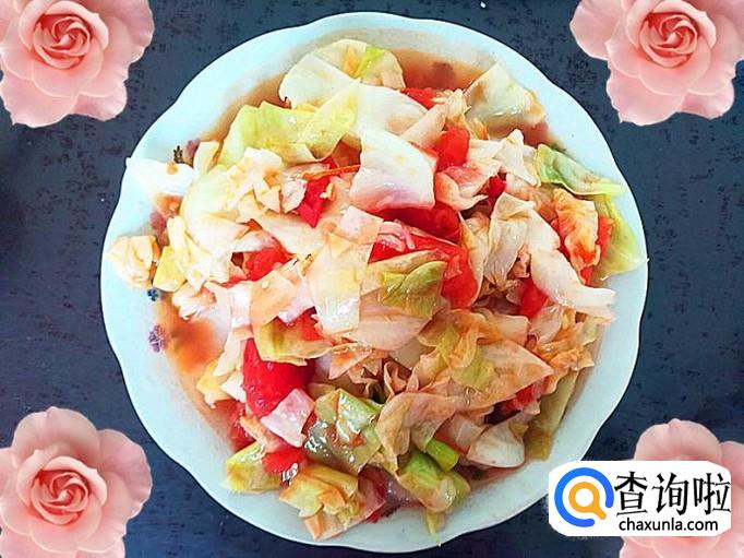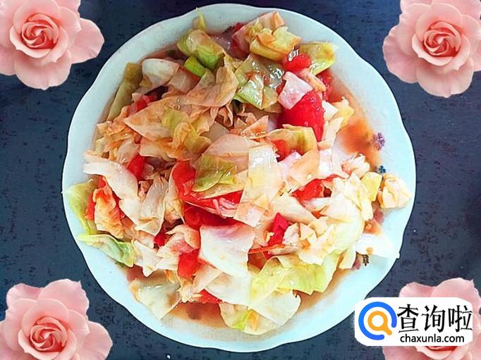 装盘,一盘番茄炒甘蓝菜就做好了。此菜肴味道鲜美可口,特别的好吃。