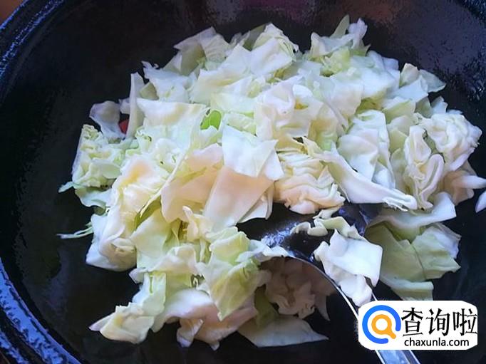 加入葱爆炒出香味后,倒入切好的甘蓝一起爆炒片刻。