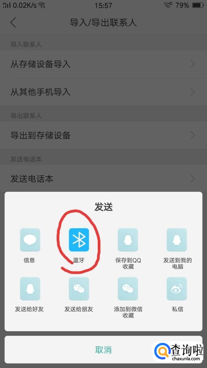点击发送至“蓝牙”,另一部手机点击接受即可,这样手机通讯录就导入到另一个手机了。
