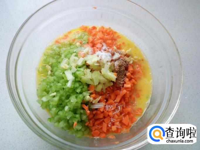 把切好的苦瓜,胡萝卜,葱,姜末,放入鸡蛋液里,放入五香粉,盐,味精,拌和均匀。