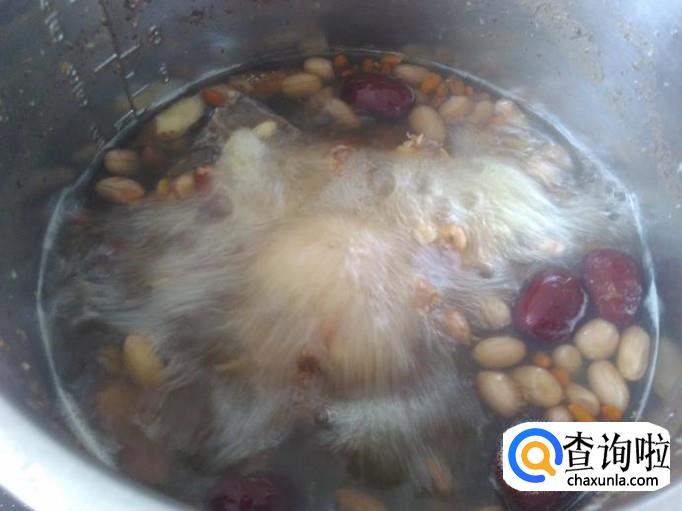 然后把牛骨捞上来放到锅里,再把花生和滋补药材放进去,加适量的盐。