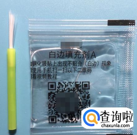 另一只手拿着白边消除液,用刷子蘸取消除液,沿着手机钢化膜边缘的缝隙,慢慢的填充液体。