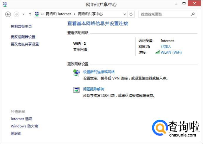 打开“网络和共享中心”,然后点击“WLAN(WiFi)”。