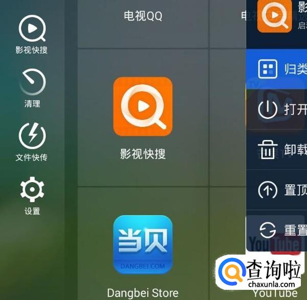 下载完当贝市场后,我们就可以进行操作了,然后我们先用遥控器找到最左侧的影视快捷,然后点击进入。