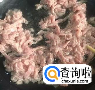 锅内放入适量油同时加热,把腌制好的肉丝倒入。肉丝变色后盛出来备用。