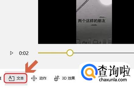 接着在新页面中,将左上角的视频拖动到下方的故事板上,然后软件右侧就会看到这则视频的播放界面,播放界面的左下方有一项“文本”,见图二...