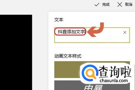 点击文本以后在切换到的窗口最右侧文本框输入需要的文字内容,比如下图的“抖音添加文字”,这样视频指定的位置即可看到这段文字了,我们点击“完成”然后将带有文字的视频导出到手机再发布到抖音就可以了;